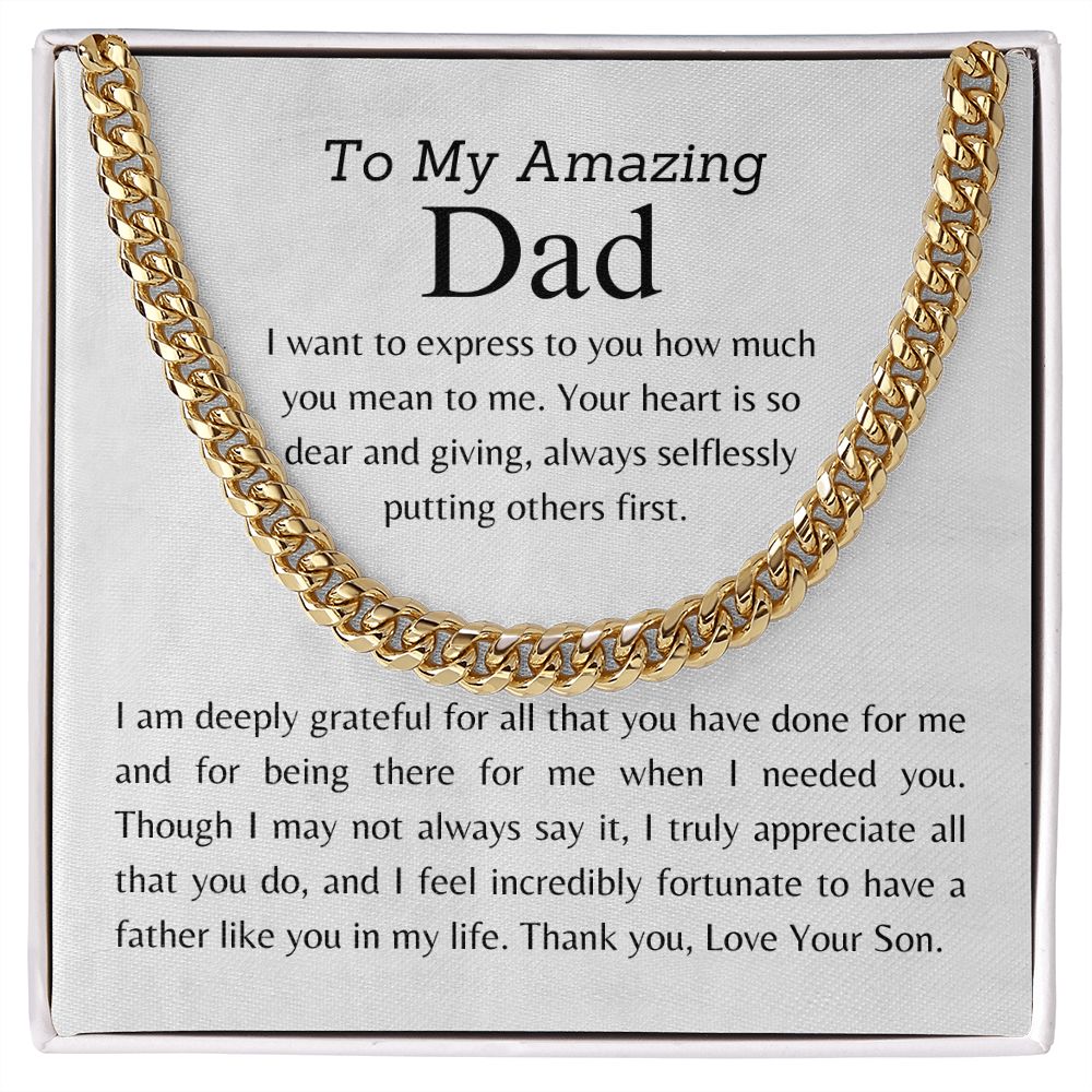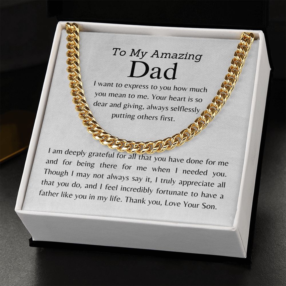 "I want to express to you how much you mean to me. Your heart is so dear and giving, always selflessly putting others first. I am deeply grateful for all that you have done for me and for being there for me when I needed you. Though I may not always say it, I truly appreciate all that you do, and I feel incredibly fortunate to have a father like you in my life. Thank you, Love Your Son."
