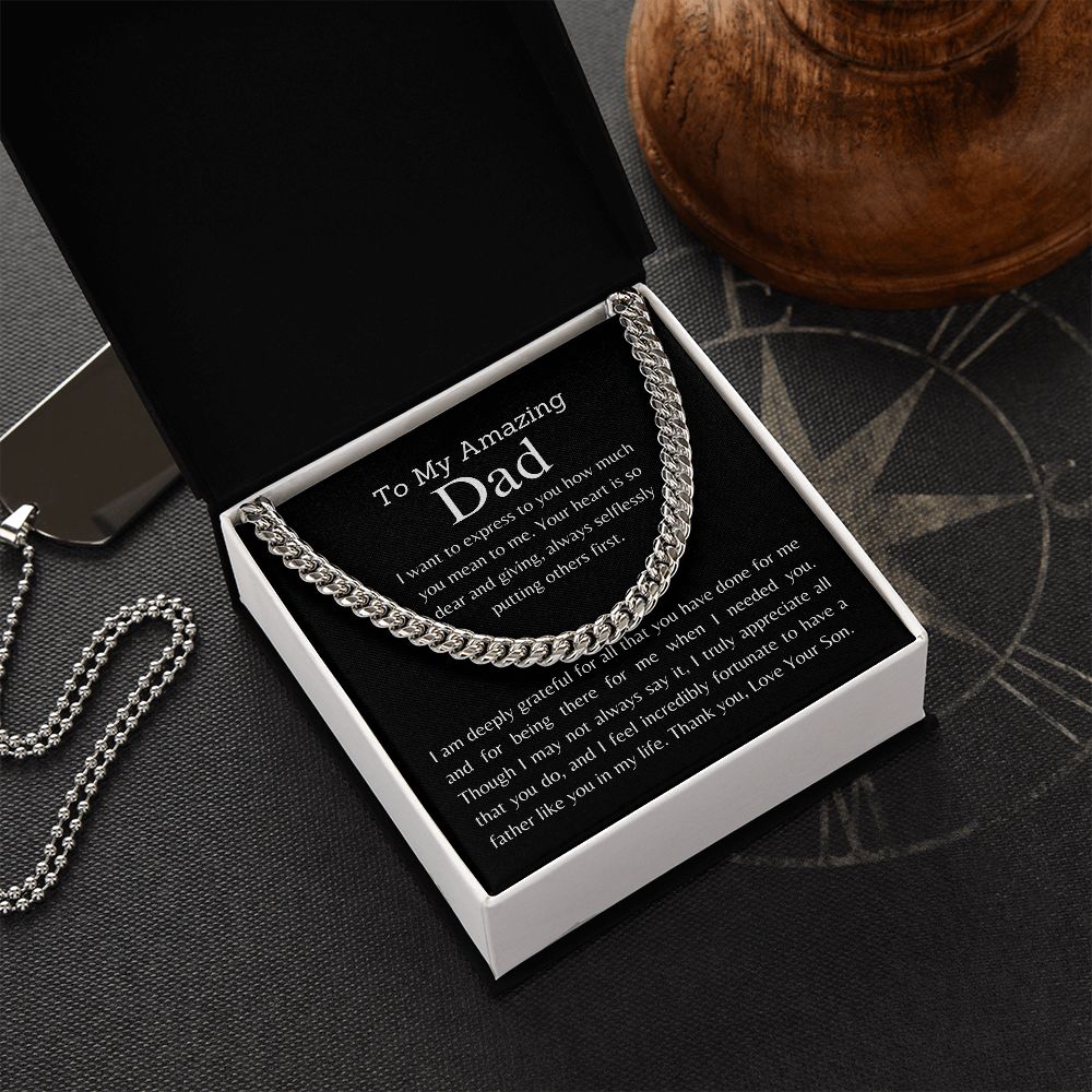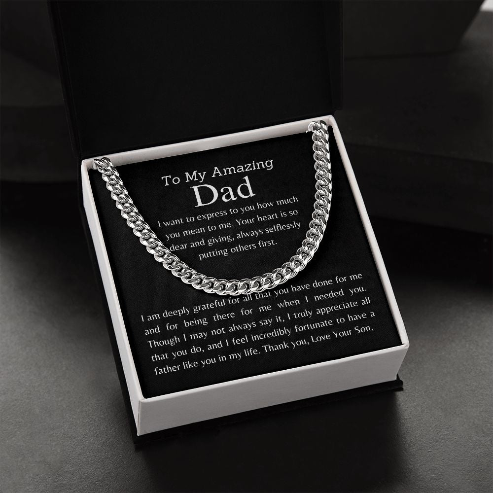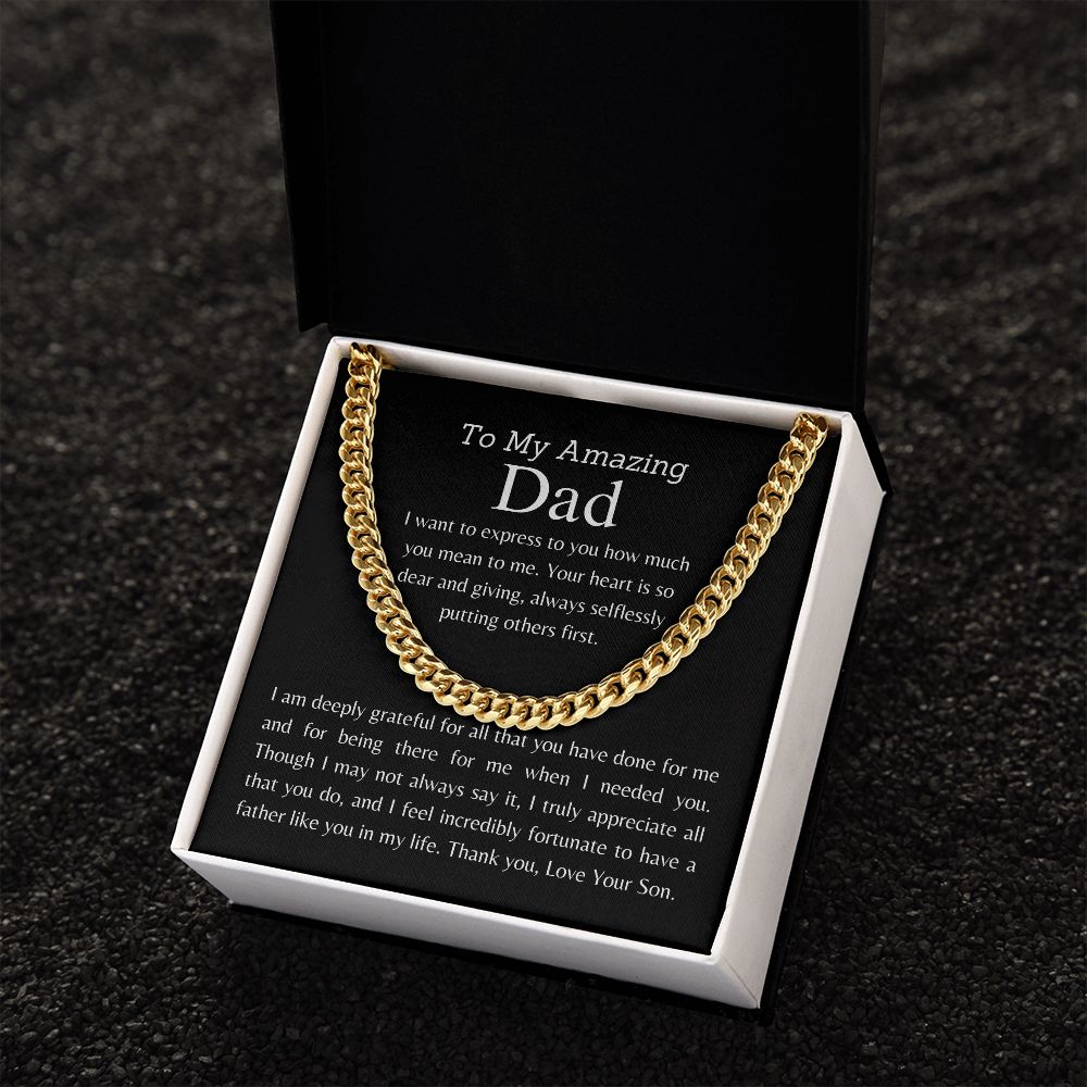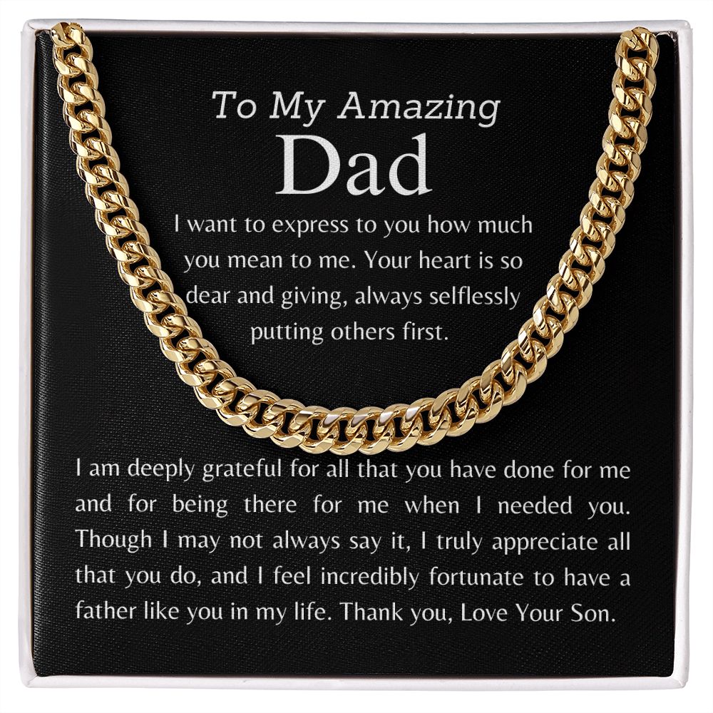 "I want to express to you how much you mean to me. Your heart is so dear and giving, always selflessly putting others first. I am deeply grateful for all that you have done for me and for being there for me when I needed you. Though I may not always say it, I truly appreciate all that you do, and I feel incredibly fortunate to have a father like you in my life. Thank you, Love Your Son."
