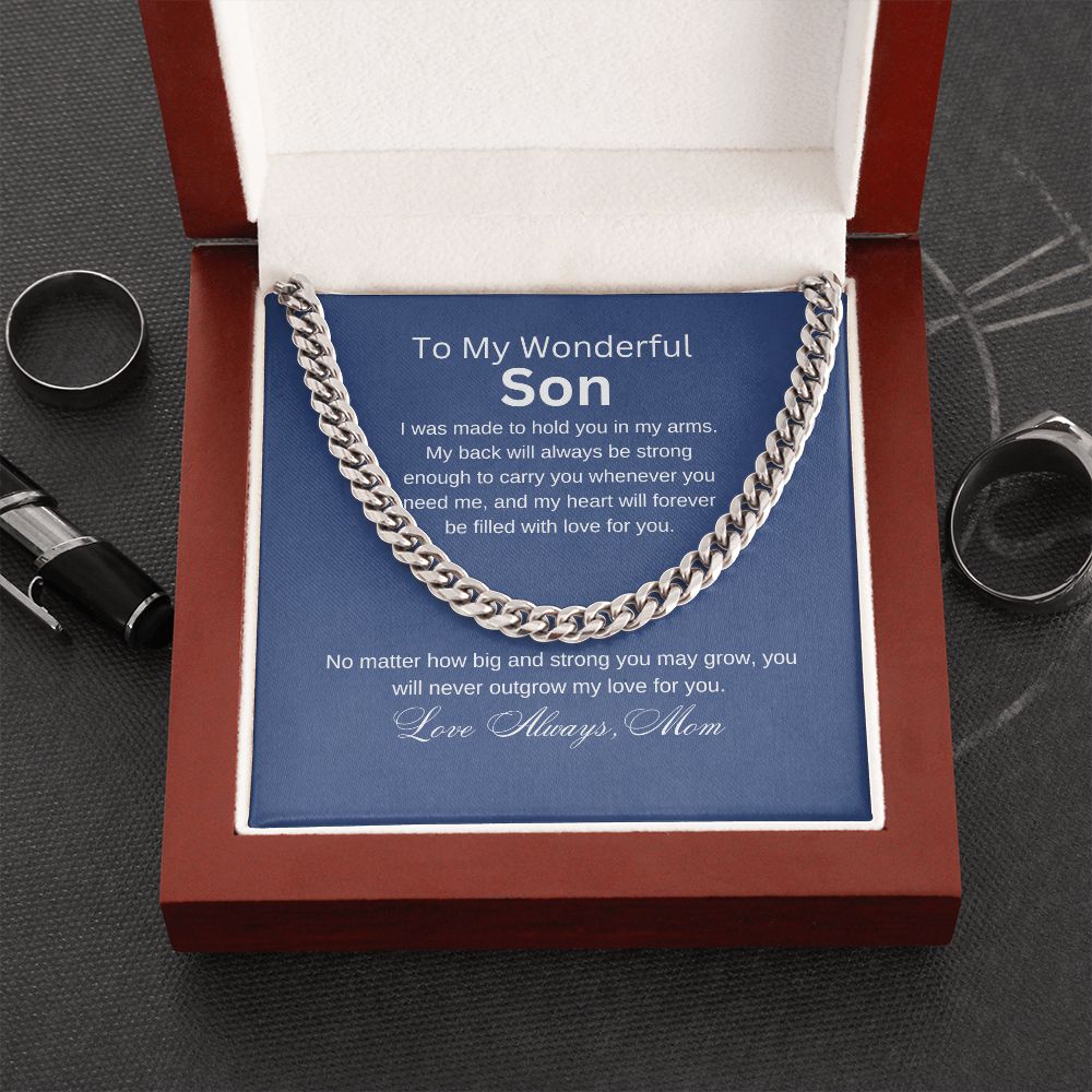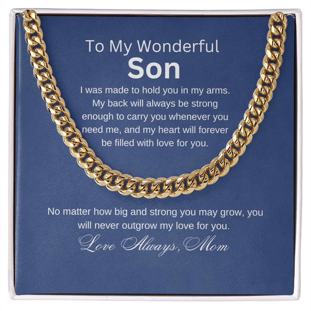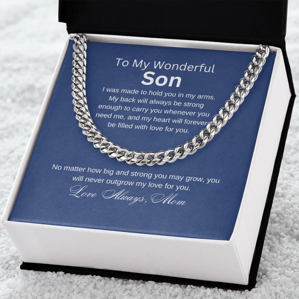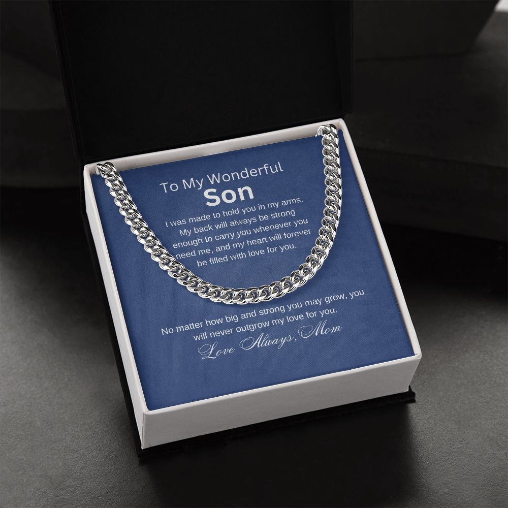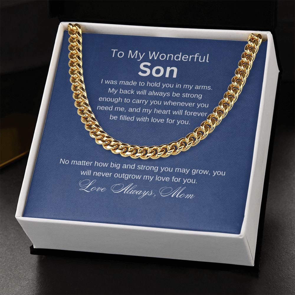 "I was made to hold you in my arms. My back will always be strong enough to carry you whenever you need me, and my heart will forever be filled with love for you. No matter how big and strong you may grow, you will never outgrow my love for you. Love Always, Mom"