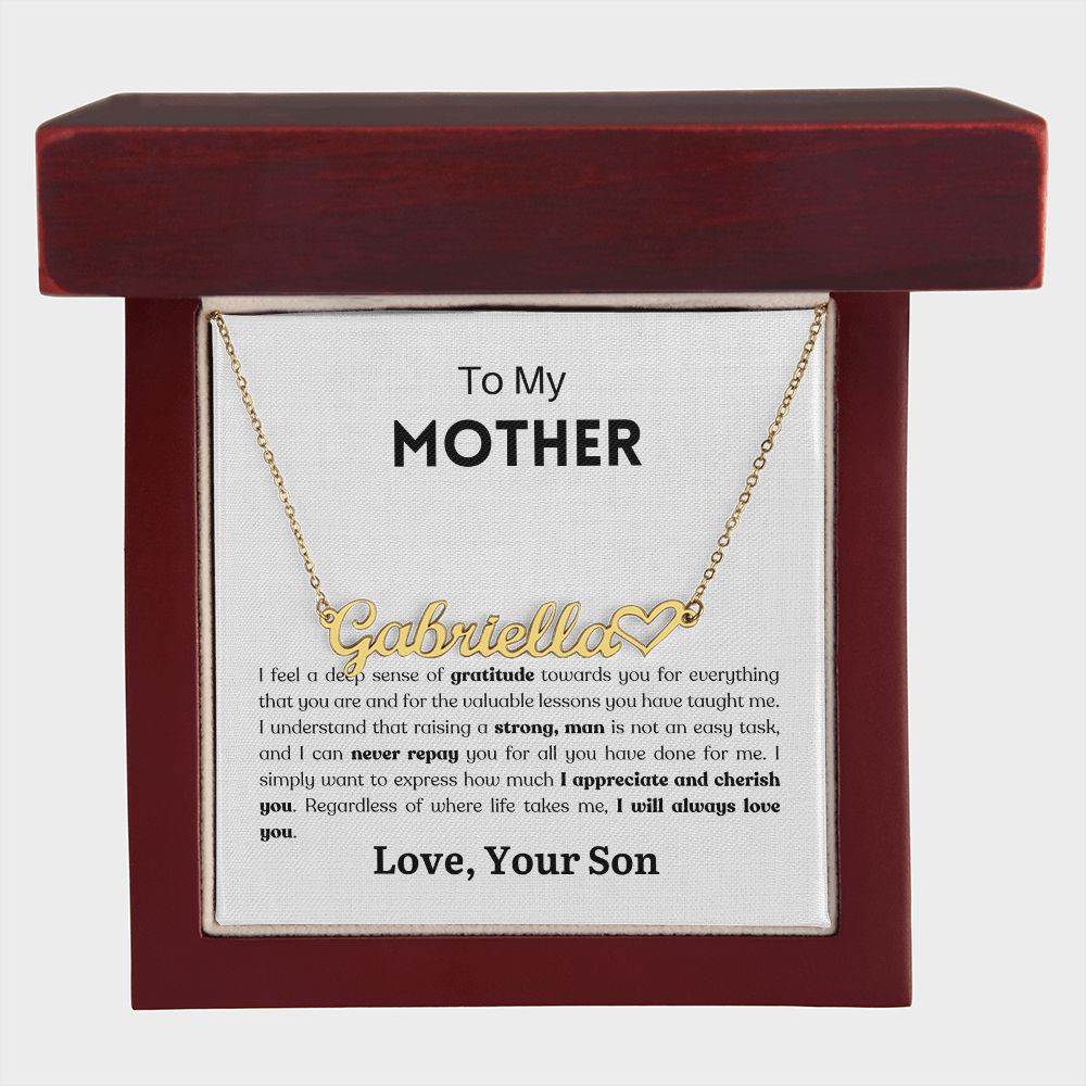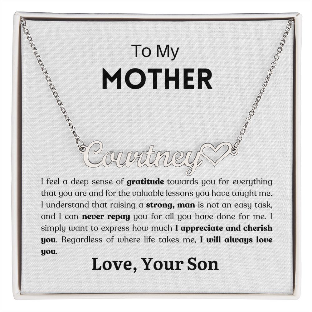"I feel a deep sense of gratitude towards you for everything that you are and for the valuable lessons you have taught me. I understand that raising a strong, man is not an easy task, and I can never repay you for all you have done for me. I simply want to express how much I appreciate and cherish you. Regardless of where life takes me, I will always love you."