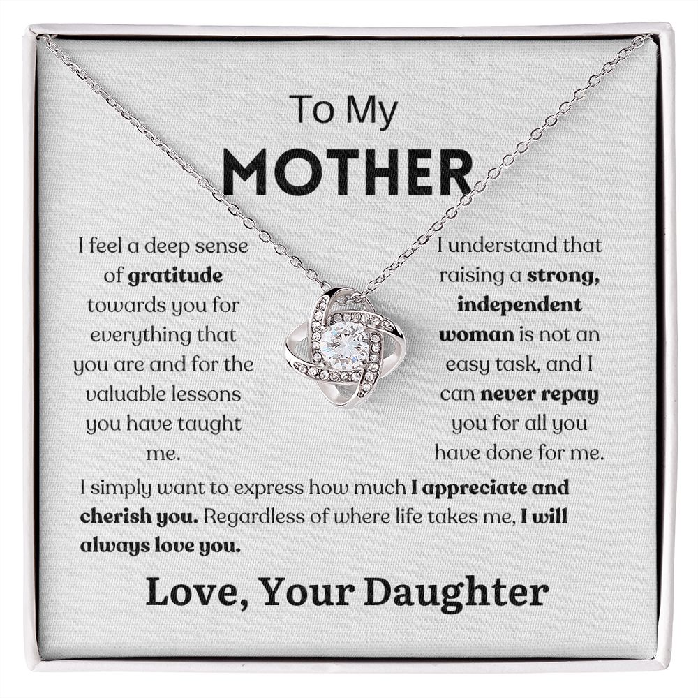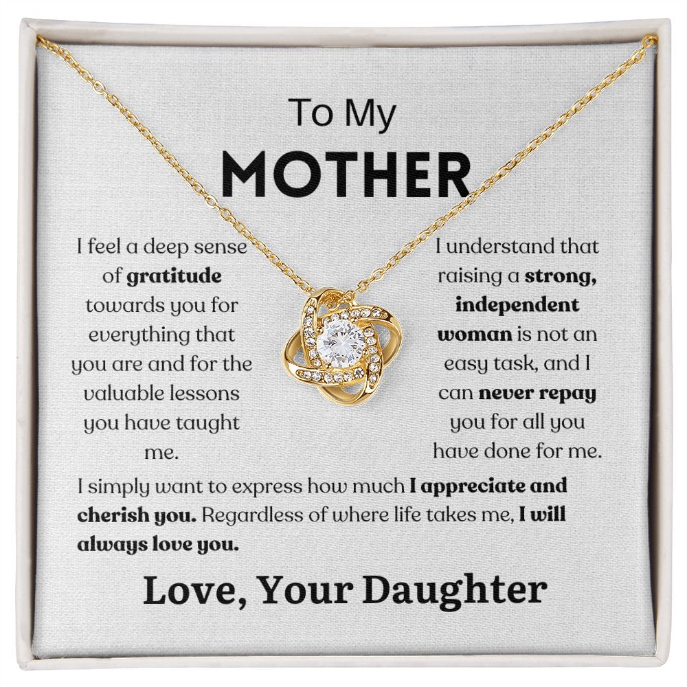 "I feel a deep sense of gratitude towards you for everything that you are and for the valuable lessons you have taught me. I understand that raising a strong, independent woman is not an easy task, and I can never repay you for all you have done for me. I simply want to express how much I appreciate and cherish you. Regardless of where life takes me, I will always love you. Love, Your Daughter"